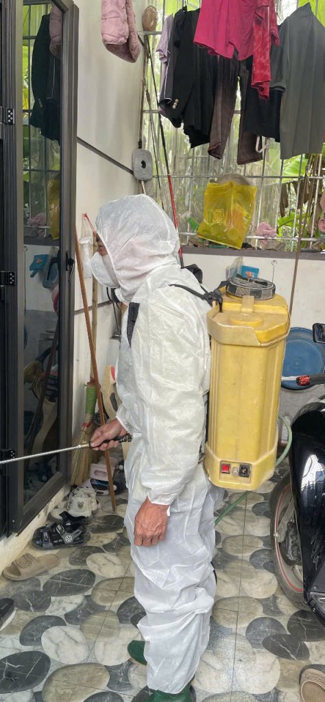 Hình ảnh cán bộ y tế thực hiện phun hóa chất tại các hộ gia đình.